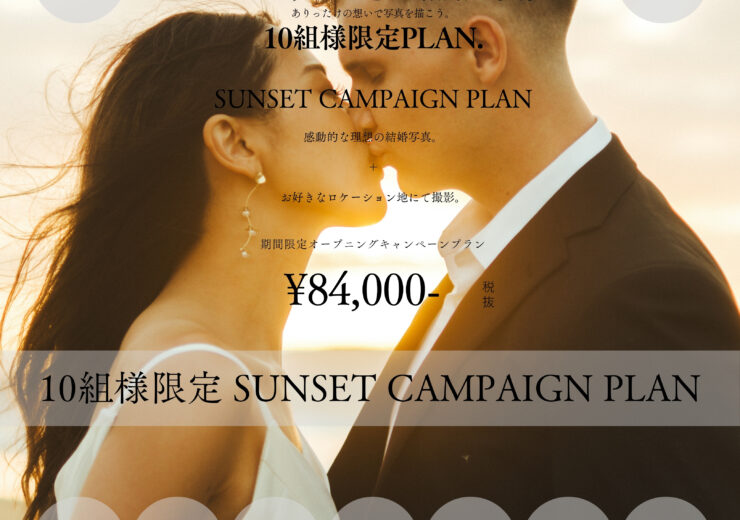 [ 撮影データ200cut / 新婦ヘアメイク / 新郎衣装1着付 / 新婦お好きなドレス1着付 / 日中+サンセット撮影 / お好きなロケ地 / WEB打ち合せ / 土日UP料金なし ]